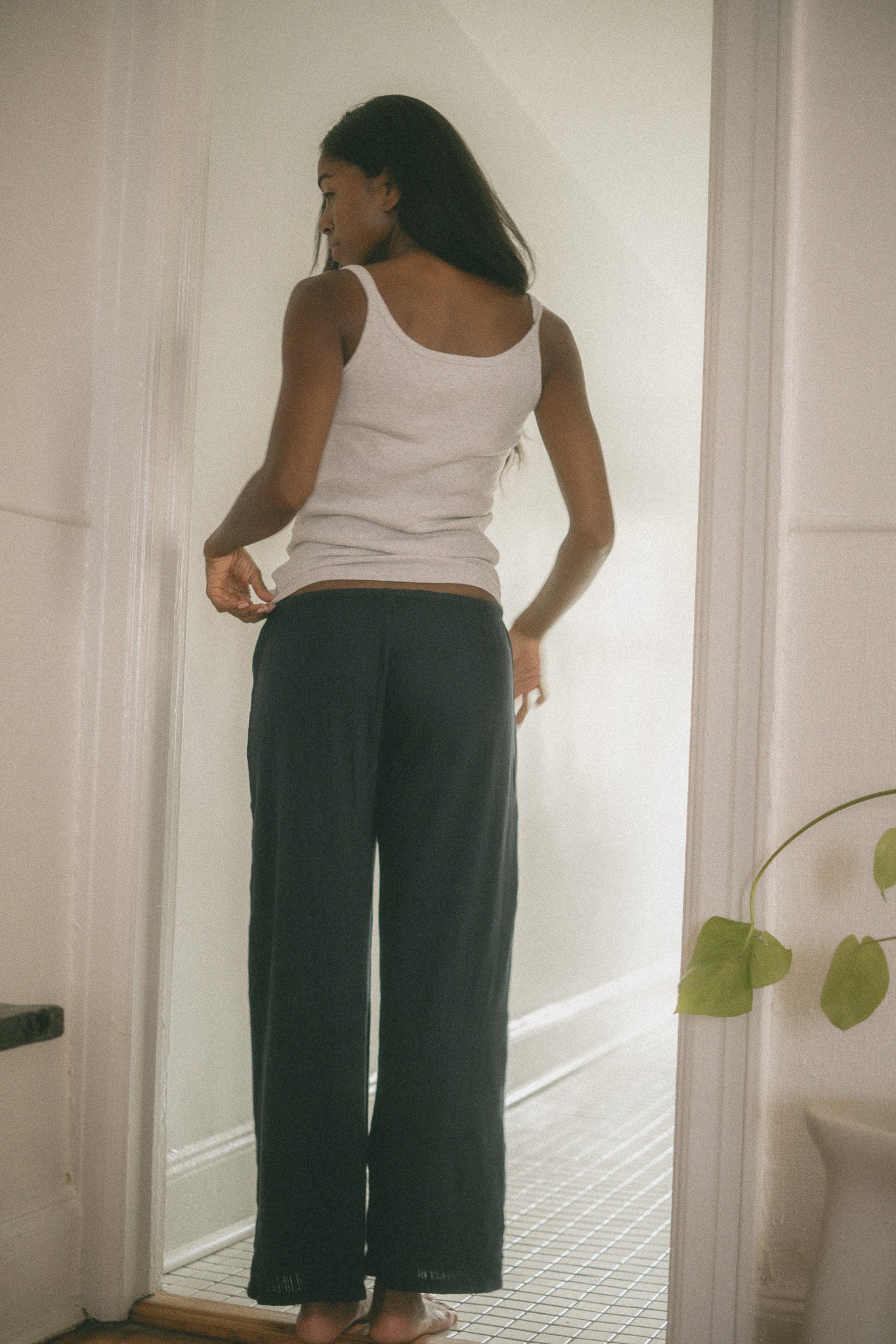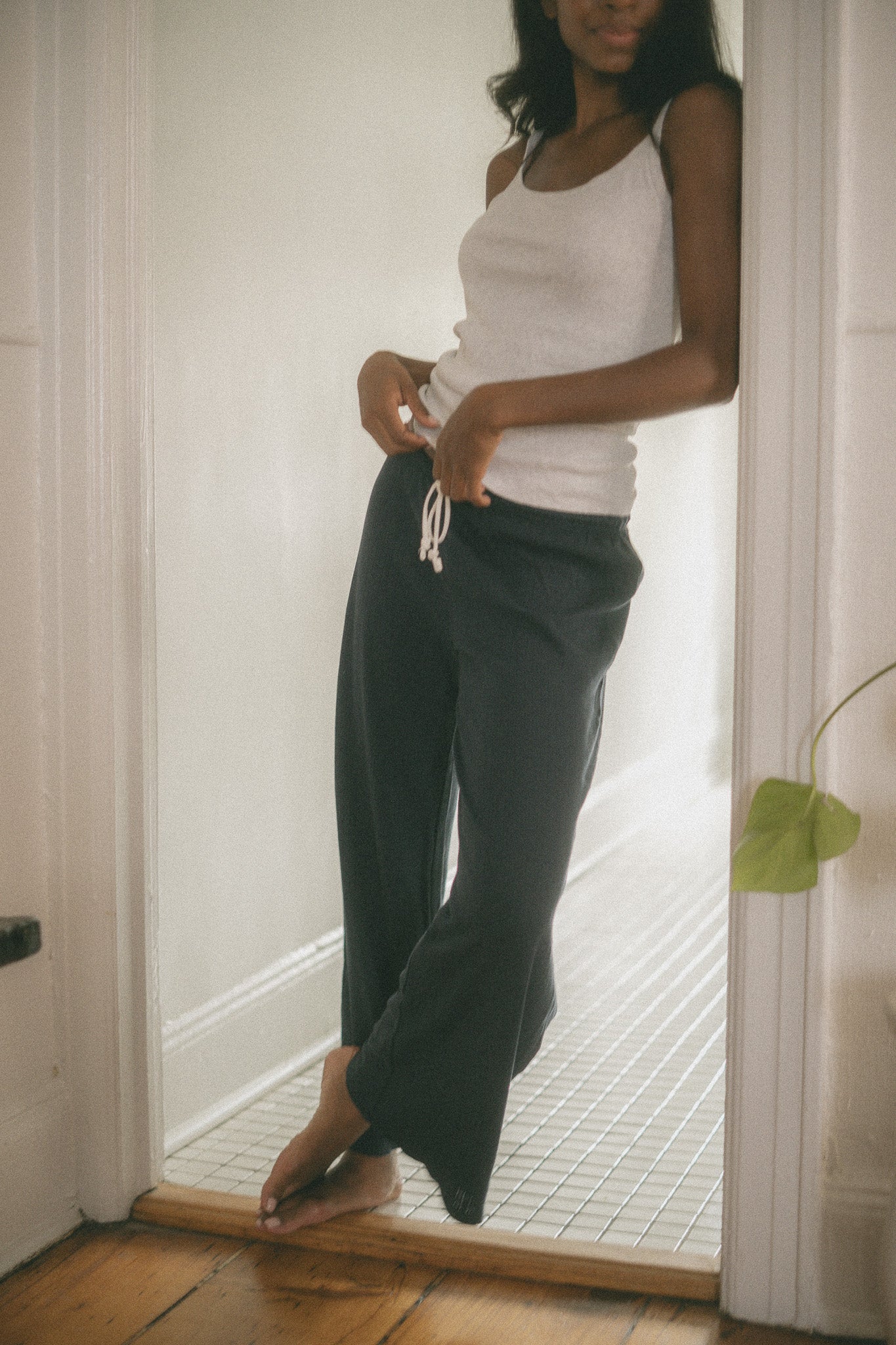 Cozy wide leg pants with an elastic waistband and drawstring in a pointelle print.