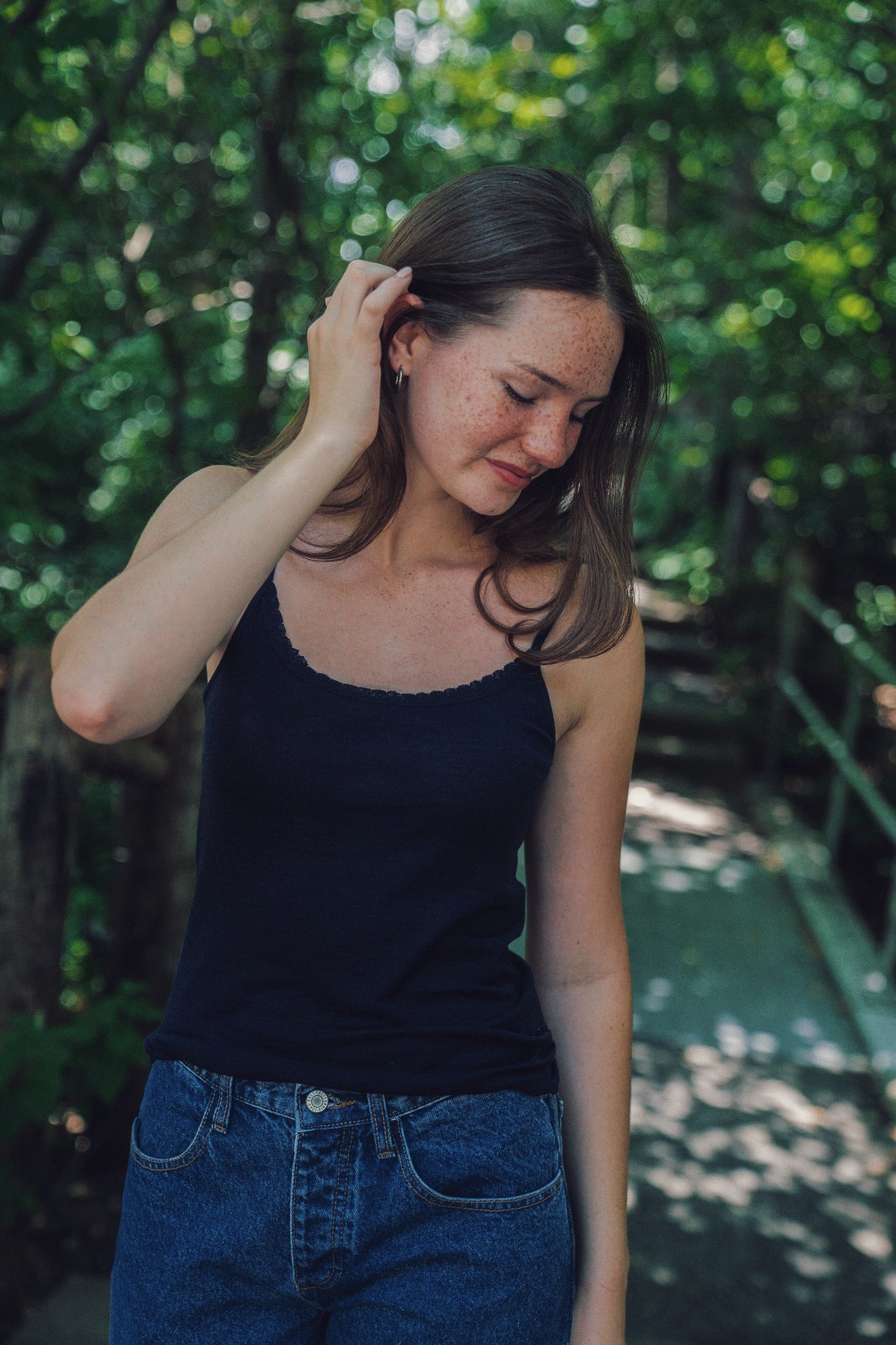 Light weight silk and wool blend scoop neck tank with a lace trim.