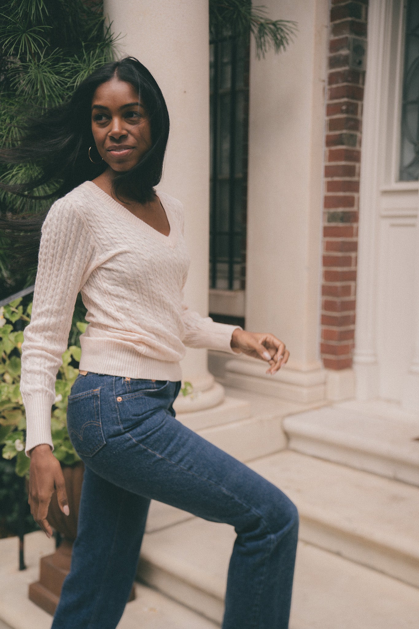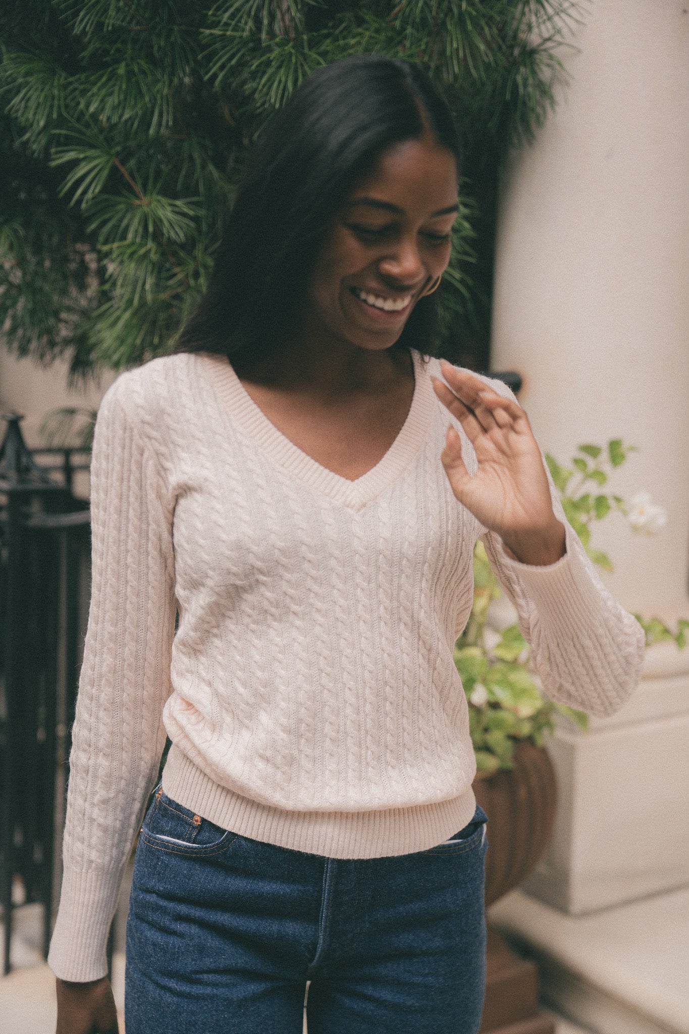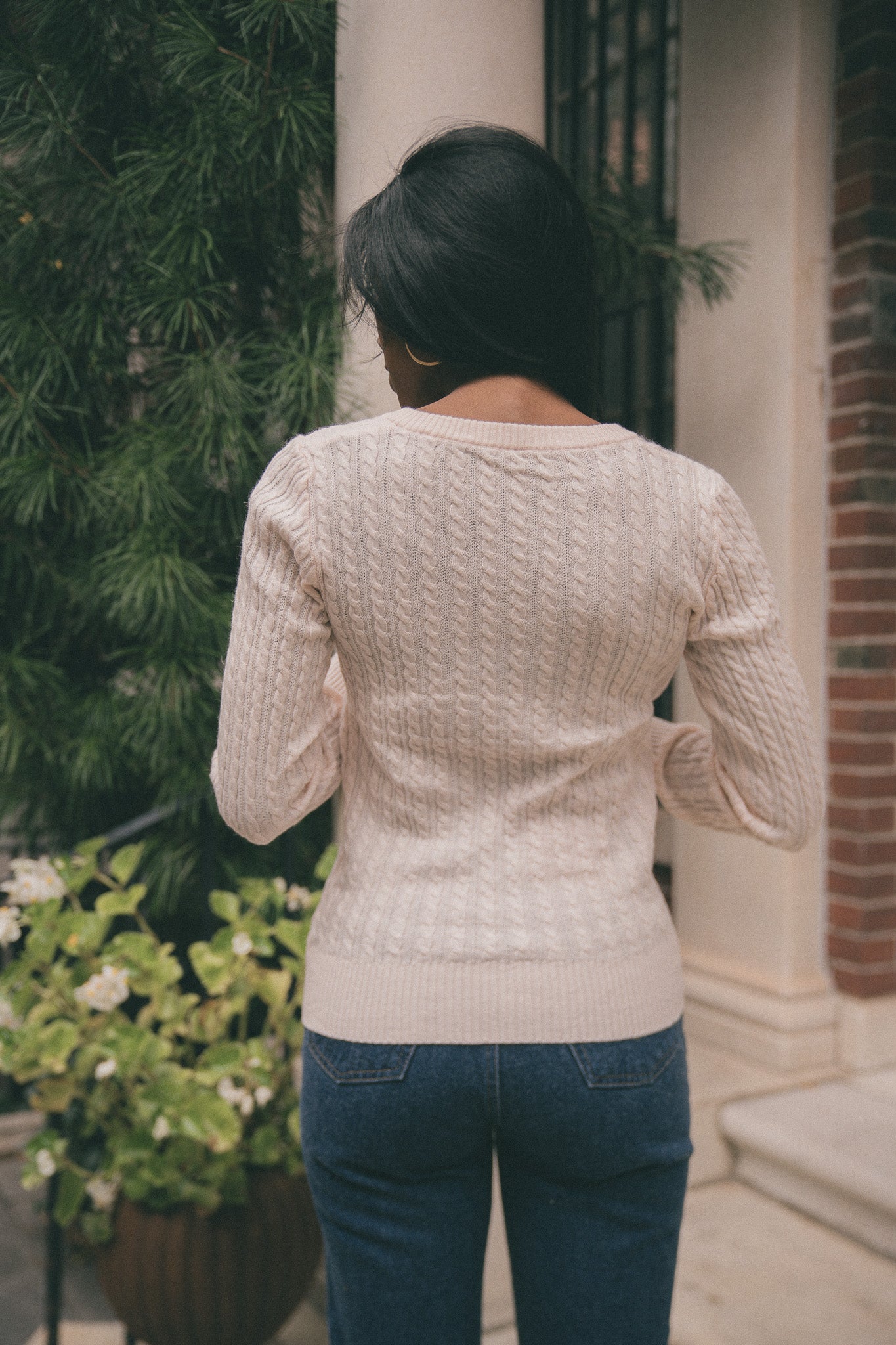 Comfortable, cozy, v-neck, fitted cable knit cardigan.