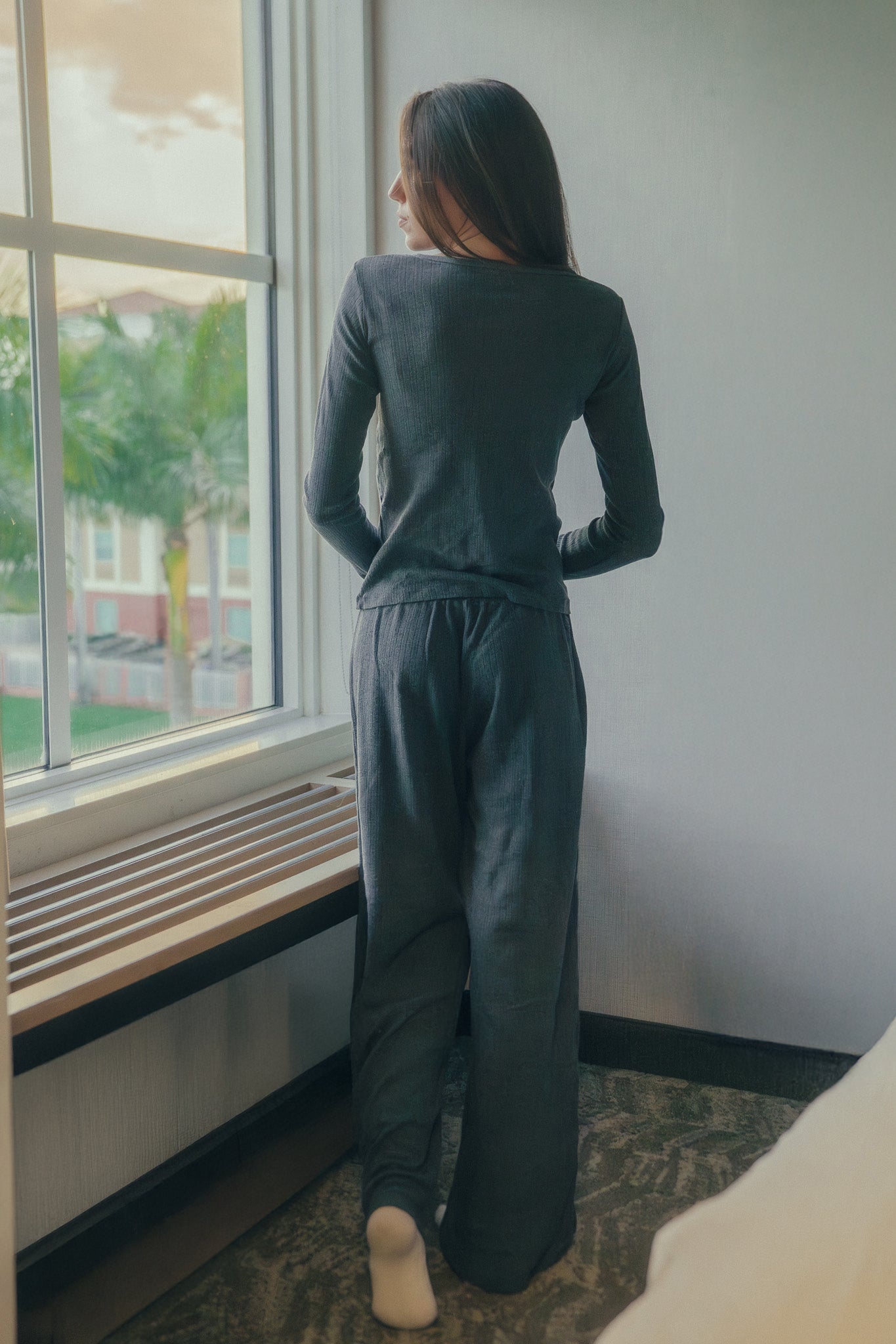 Cozy wide leg pants with an elastic waistband and drawstring in a pointelle print.