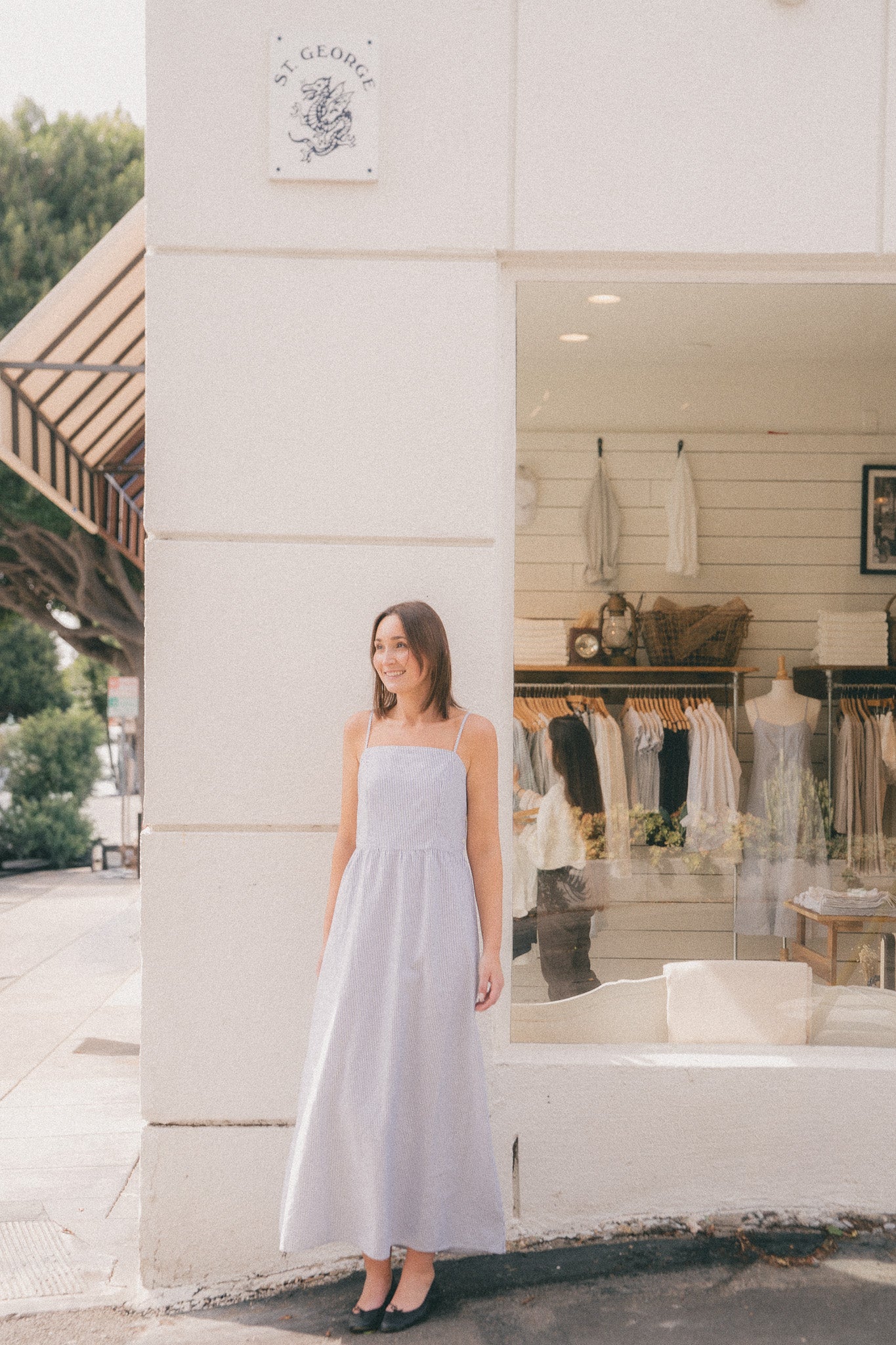 Long spaghetti strap pinstripe dress, adjustable straps, and side button details.