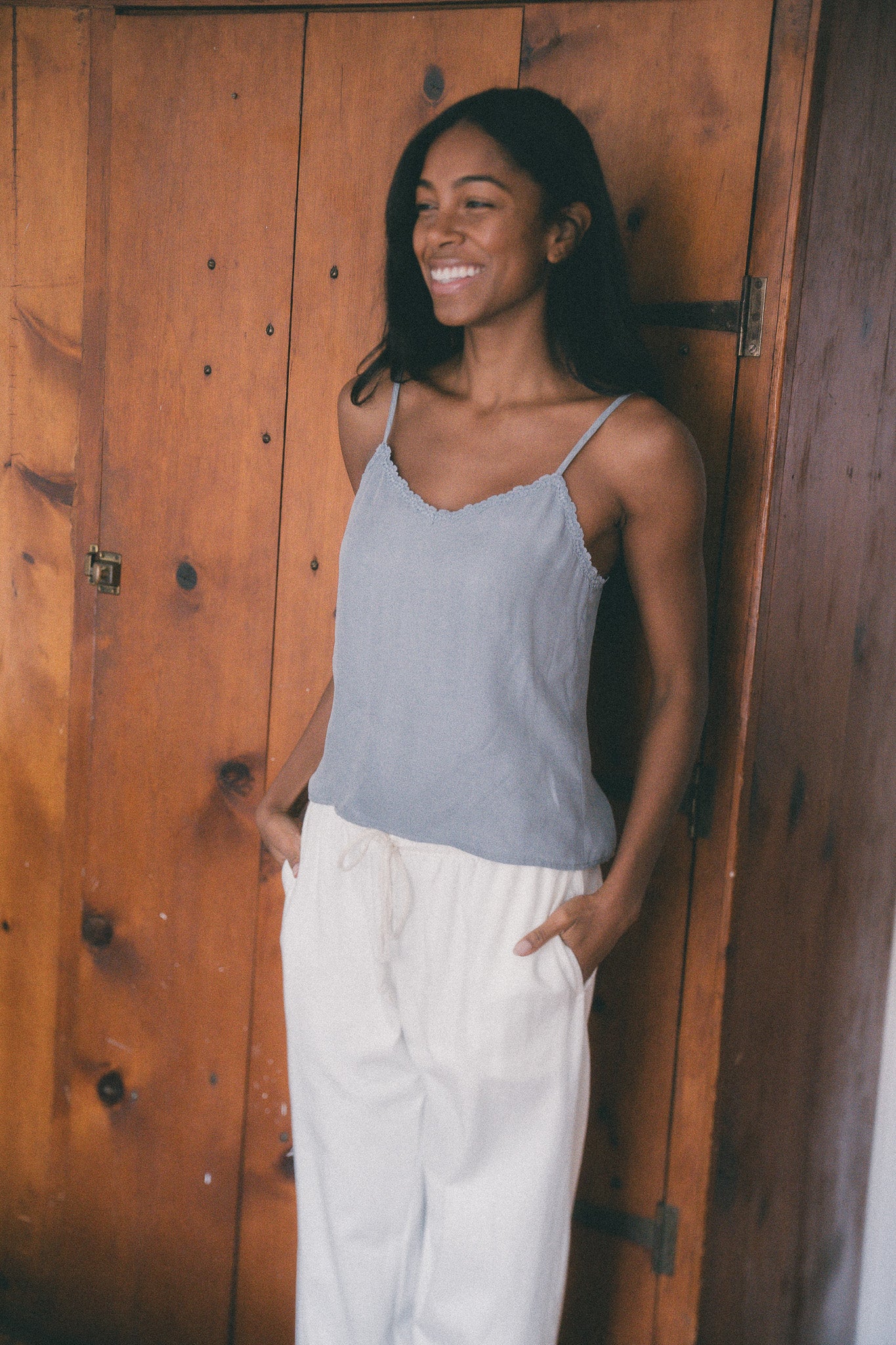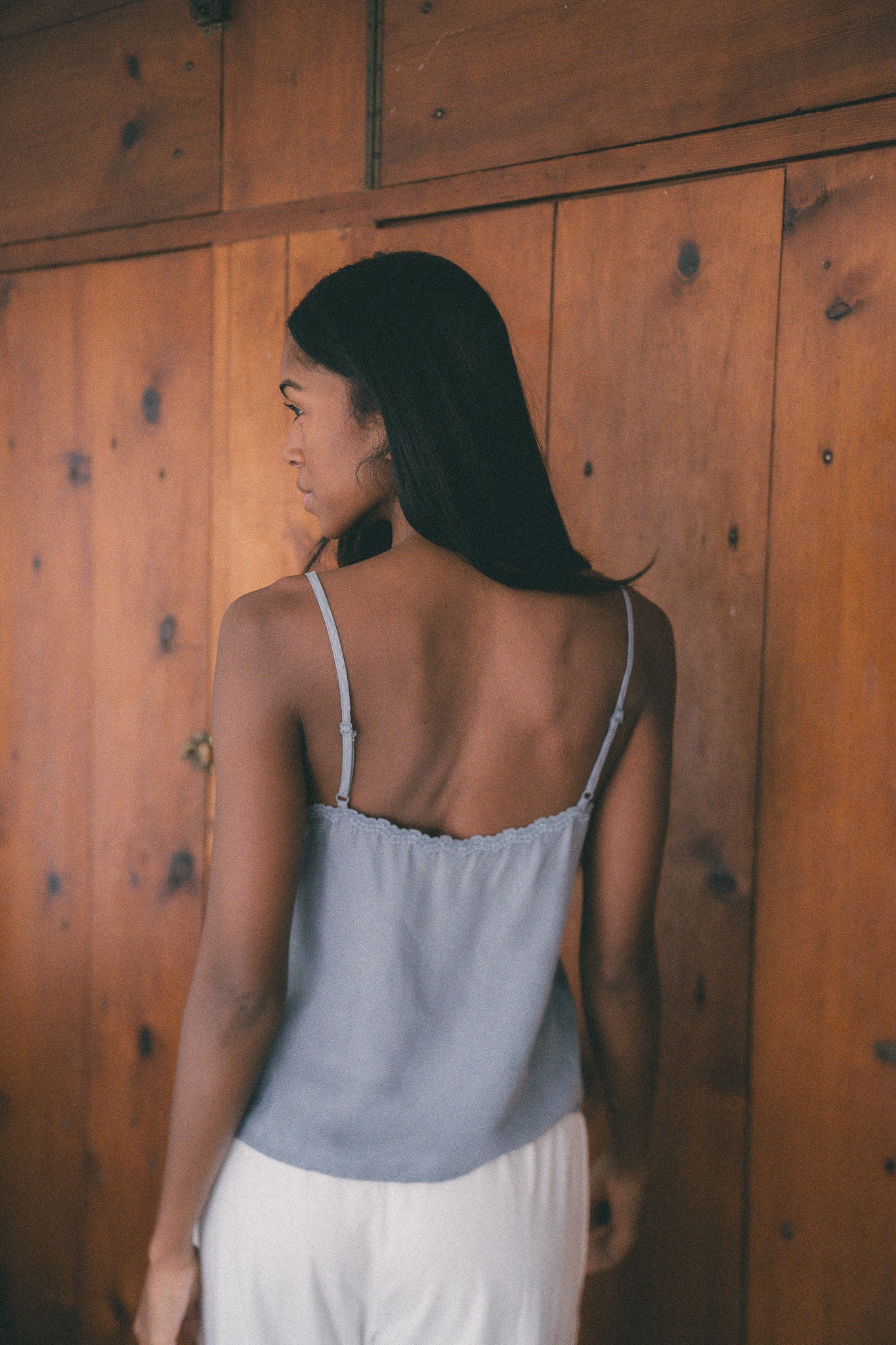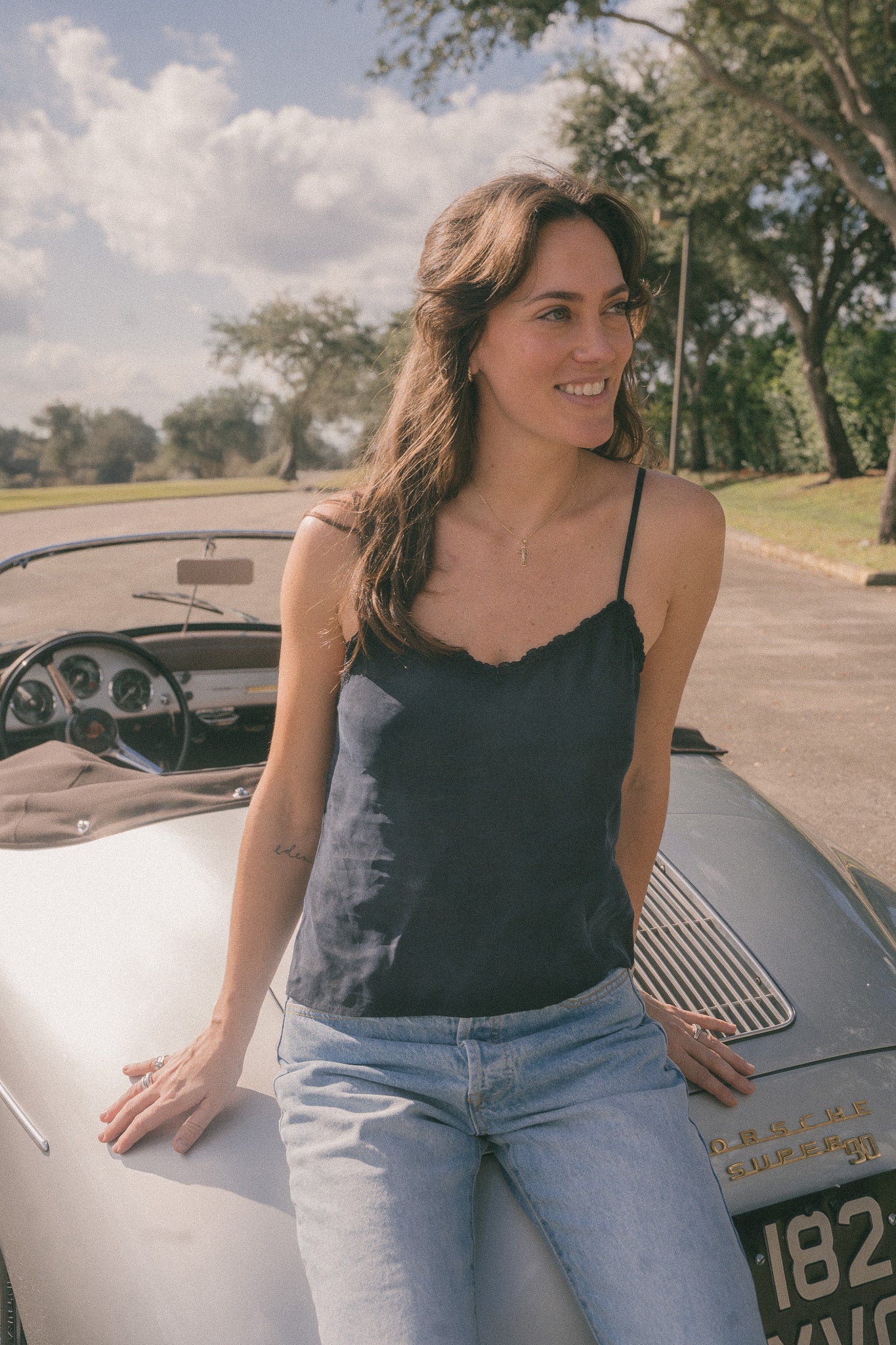 Lightweight cupro blend tank with a lace trim, adjustable straps, and a low back.